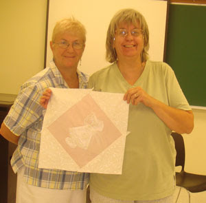 Here are my two volunteers (Roberta on the left and Beth on the right) on day two, with one of the blocks ready to go into the quilt: